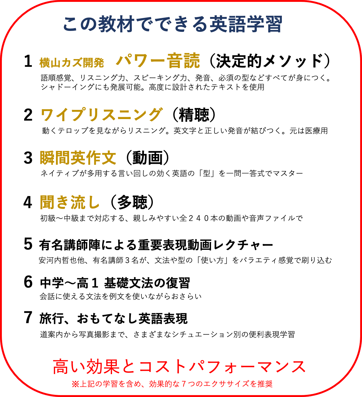 この教材では、長短織り交ざった会話文のテキストを使い、口・耳・目を動かすエクササイズで、英語という言語のエッセンスである語順や基本文型を身体で覚え直します。